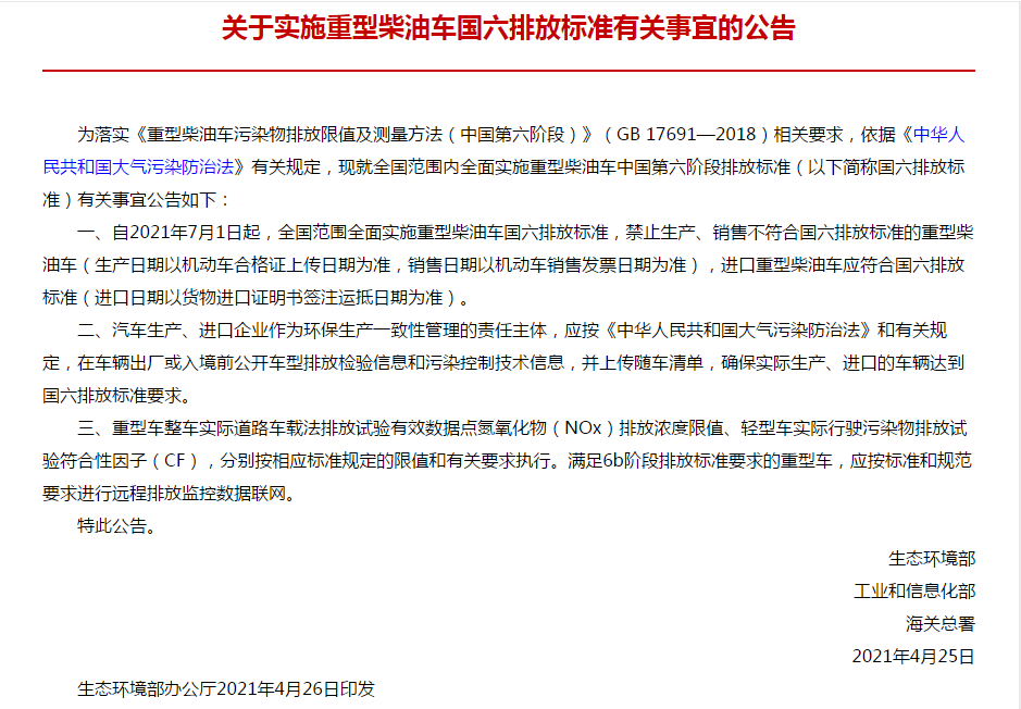 2021年4月26日,**生態(tài)環(huán)境部、工業(yè)和信息化部、海關(guān)總署印發(fā)《關(guān)于實施重型柴油車國六排放標準有關(guān)事宜的公告》(公告 2021年 第14號)。